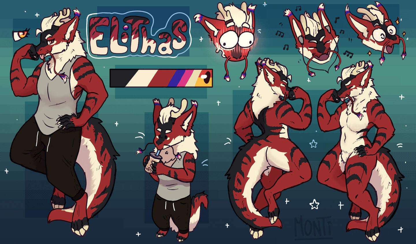 Simple referece are : front and back view, name, specie or gender, a color pallet + 1 charm .